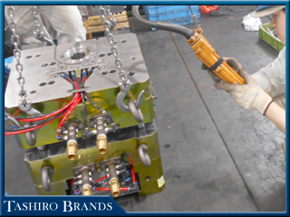 スムーズに摺動し、お客様立会いの下、OKがいただければ金型に冷却部品、油圧シリンダーなどの部品を組み付けていきます。